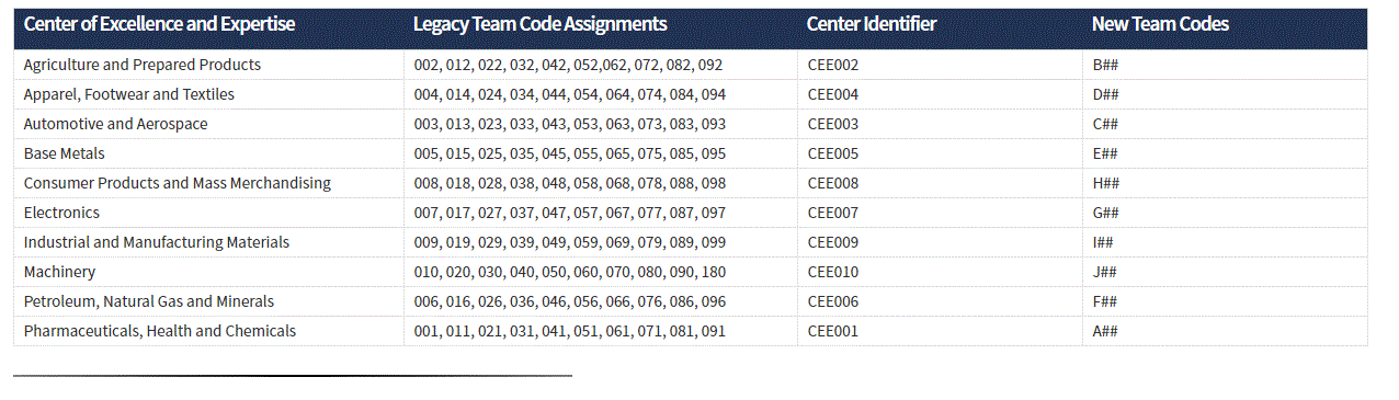 The new team codes will follow an alphabetical format, e.g. ABC, where the first letter will represent a Center, and the secondary and tertiary letters will be used by the Centers to direct transactions to a specific work unit or team.